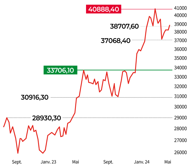 Le Dow Jones vient d’inscrire un nouveau record absolu au-delà des 40 000 points, porté par les bons résultats de sociétés américaines et les espoirs d’une baisse de taux outre-Atlantique cette année. En données hebdomadaires, la dynamique haussière ne sera pas remise en cause tant que l’indice demeure au-dessus des 37 860 points, plus bas de mi-avril. À court terme, l’indice pourrait néanmoins marquer une pause après une pause de plus de 5 % le dernier mois. LP, 22/05/2024