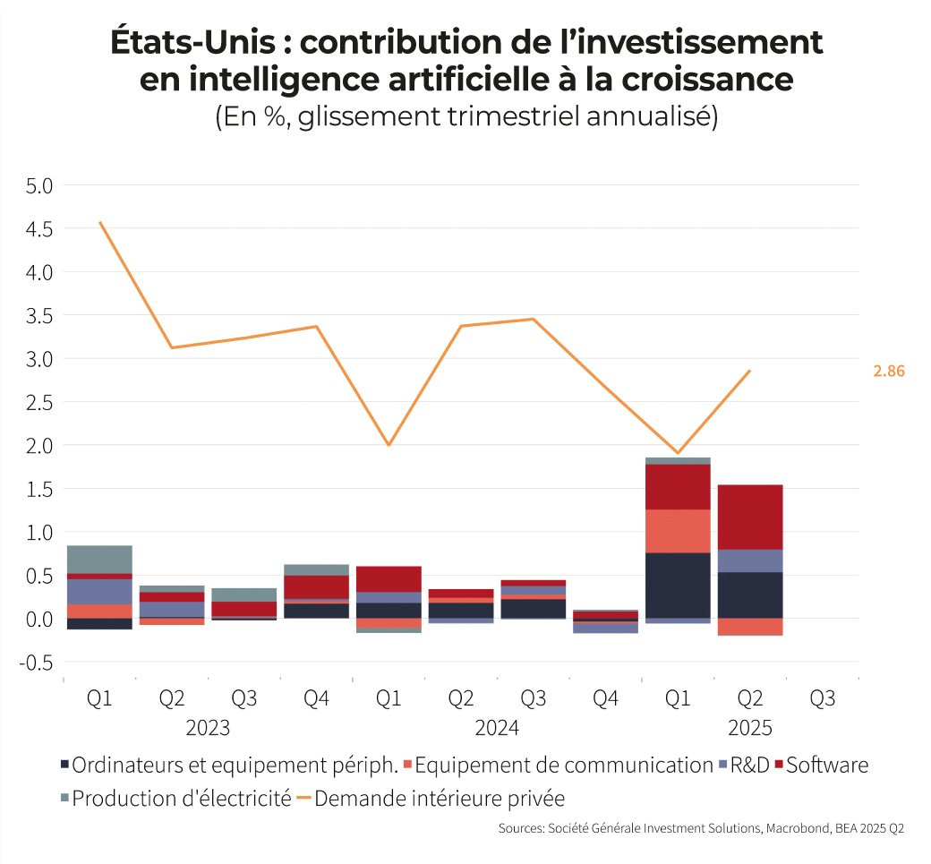 Le rallye des indices actions américains s’est poursuivi, avec depuis début septembre : +4,9 % pour le S&P 500 et +8 % pour le Nasdaq 100. Cette performance est en premier lieu le reflet de la très bonne tenue des entreprises du secteur des nouvelles technologies et spécifiquement de l’intelligence artificielle. En effet, les entreprises de ce secteur, dont à 85 % sont des entreprises américaines, ont affiché une croissance des revenus de 33 % sur un an au T2-25 alors que les estimations de croissance des profits pour les 12 mois à venir sont attendues supérieures à 30 % par les analystes. Ces perspectives positives de revenus expliquent aussi les investissements importants déjà effectués et annoncés pour les trimestres à venir.