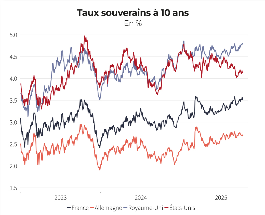 Des taux d’intérêt de long terme qui s’écartent de ceux de court terme. Les taux de court terme ont déjà bien diminué du fait de la détente passée ou à venir des banques centrales. En revanche, les taux longs souverains continueraient d’afficher des pressions haussières, avec une importante volatilité du fait de la combinaison de facteurs : la résilience de l’activité, les incertitudes sur l’inflation notamment aux États-Unis, les ingérences de Trump vis-à-vis de la Réserve fédérale et la poursuite du resserrement quantitatif, dans un contexte de hausse des émissions de dette. Plus spécifiquement en France, les taux longs subissent une pression particulière du fait de la nouvelle résurgence du risque politique.