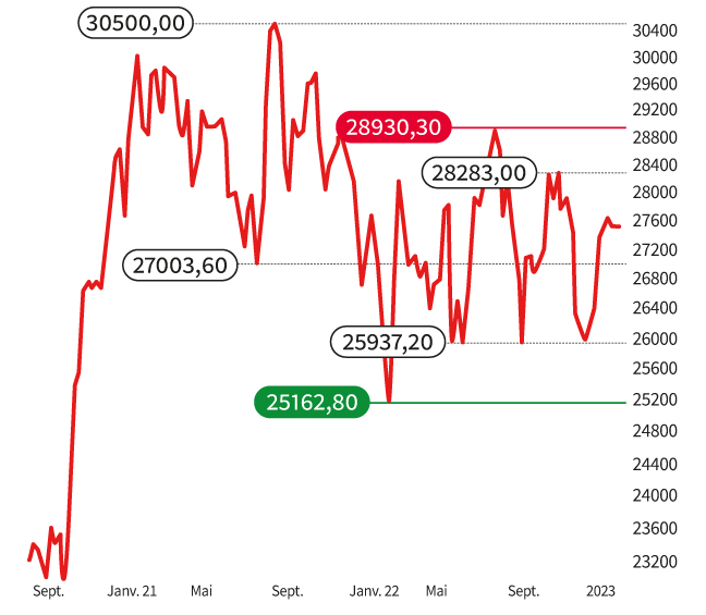 la persistance des tensions inflationnistes qui sèment le doute sur la trajectoire de la Réserve Fédérale. L’indécision perdure et l’indice devra désormais s’extraire de la zone des 32 830/34 430 points pour renouer avec une dynamique affirmée. LP, 20/02/2023
