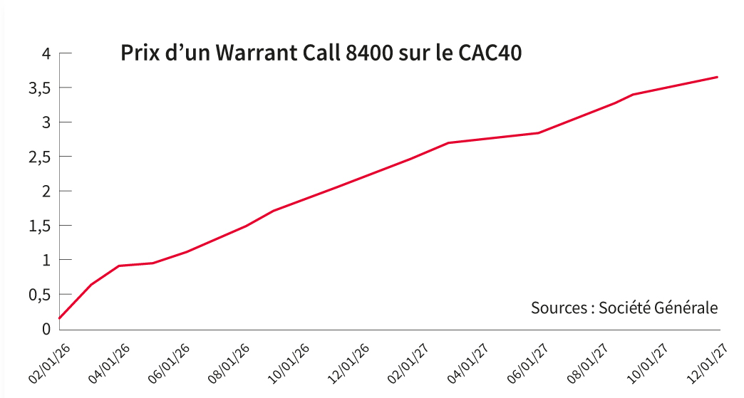 Pour les produits à maturité, le détachement effectif du dividende n’a pas d’impact sur les caractéristiques du produit. Celui-ci est anticipé dans le calcul du prix du produit et la baisse du sous-jacent lors du détachement du dividende est sans effet sur le prix d’un Call ou d’un Put. L’effet dividendes est toutefois à prendre en compte pour l’établissement de votre scénario d’investissement. En effet, en l’absence de tout mouvement de marché, le niveau du CAC 40 sera inférieur de près de 200 points à la fin du mois de juin par rapport à son niveau actuel. Un Warrant Call juin 2026 dont le prix d’exercice est égal au cours actuel de l’indice est ainsi en dehors de la monnaie.