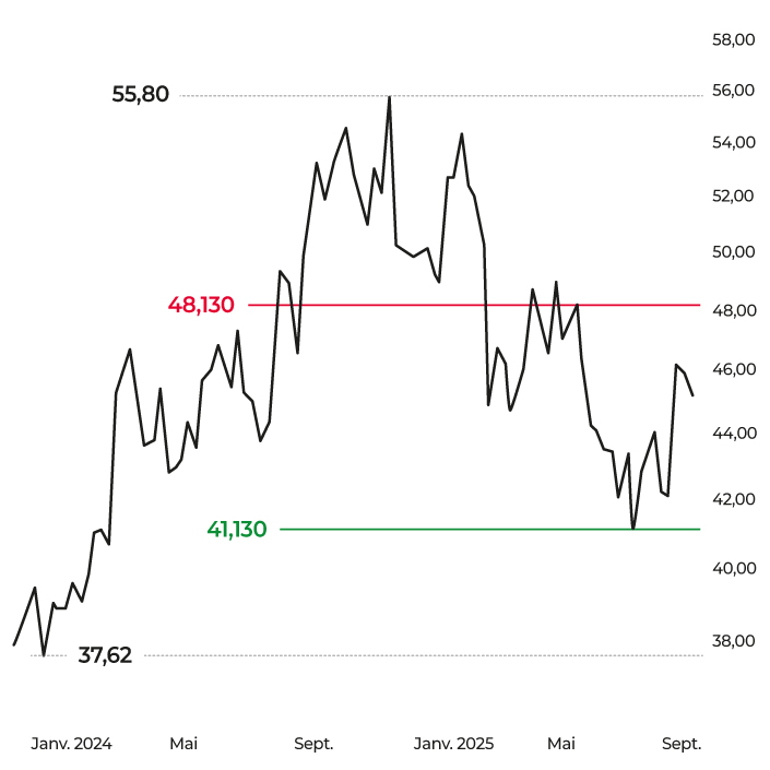 Il faut dire qu’Inditex conserve d’excellents fondamentaux avec une excellente logistique intégrée et une rapide réactivité quant aux évolutions de tendances et aux envies des consommateurs. Un nouveau centre de distribution en Espagne doit encore renforcer cet avantage compétitif. Sur la dernière décennie, ventes et bénéfices ont doublé, preuve d’une profitabilité exceptionnelle par rapport aux concurrents du secteur. Inditex a connu un début d’année difficile mais le groupe a prouvé par le passé sa capacité à rebondir. C’est ce sur quoi parient les investisseurs. Nous sommes positifs sur la valeur avec un prix cible à 55 EUR à moyen terme.