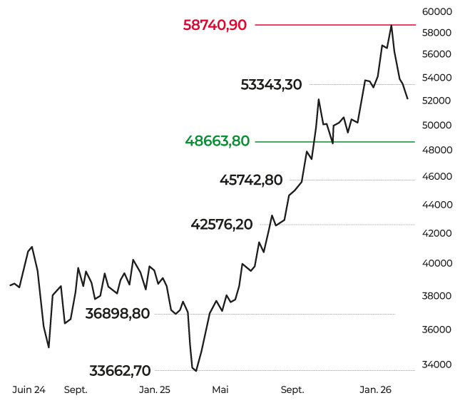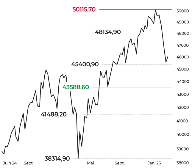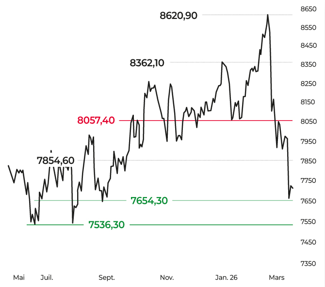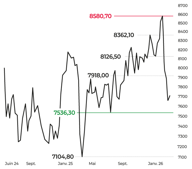 D’un point de vue technique, la dynamique s’est dégradée. En données hebdomadaires, le CAC 40 se maintient pour le moment au sein du range 7 536/8 580 points, revenant tester la borne basse. À plus court terme, la tendance est baissière sous les 8 057 points, niveau correspondant à la moyenne mobile à 20 jours. La zone des 7 536 points devra engendrer une réaction positive sous peine d’une consolidation de plus forte ampleur en direction des 7 400/7 285 points. Un retour dans cette zone de cours pourrait néanmoins constituer une opportunité de revenir à l’achat dans une optique moyen terme.