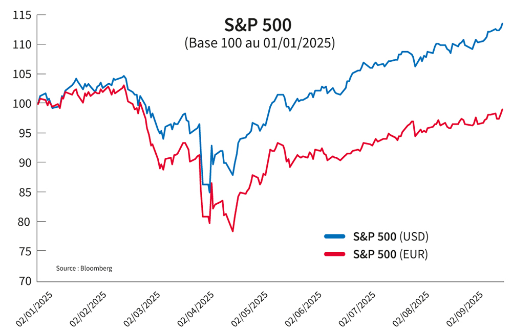 Les investisseurs en titres US ont eu l’occasion de se rendre compte de cet impact cette année. Alors que le S&P 500 affiche une performance positive de 14 % depuis le début de l’année, un investisseur français exposé à cet indice constatera une performance en euro négative de 0,8 % de son portefeuille. La baisse marquée du dollar par rapport à l’euro a ainsi plus qu’effacé la hausse de l’indice.
