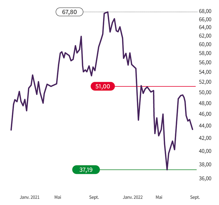Notre équipe d’experts est confiante sur la valeur dans cet environnement inflationniste et vise 53 € à moyen terme.