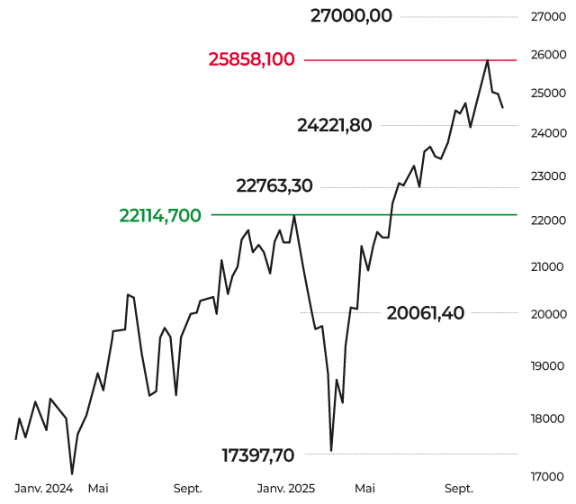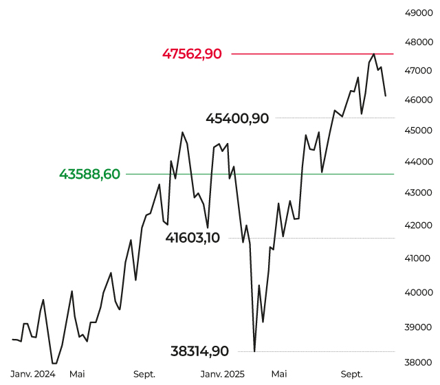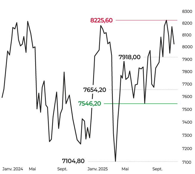 Sur un horizon de temps plus court, l’indice est revenu tester la borne basse de son range, dans la zone des 7 918 points et correspondant à ses plus bas de début novembre. Cette zone de cours devra impérativement engendrer une réaction positive, sous peine de dégagements plus marqués qui pourraient rapidement ramener l’indice vers les 7787 points, voire 7 650/7 537 points par extension.