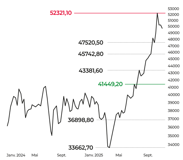 D’un point de vue graphique, la configuration du CAC 40 s’est quelque peu dégradée alors que l’indice avait enregistré un nouveau record absolu à 8 314 points, après l’annonce de la fin du shutdown. Sur un mois glissant, l’indice cède 2,5 % et ses composantes affichent des performances très disparates. Engie s’adjuge 11,1 %, Société Générale 8,9 %, Accor 6,5 %, Total 6 % et ArcelorMittal 5,3 %. À l’opposé, STMicroelectronics décroche de 26,2 %, Dassault Systèmes cède 21,4 %, Pernod Ricard 12,3 %, Edenred 12,1 % et L’Oréal 10,9 %. On notera que le luxe demeure également sous pression, avec les préoccupations persistantes au sujet de la croissance et de la demande chinoise.